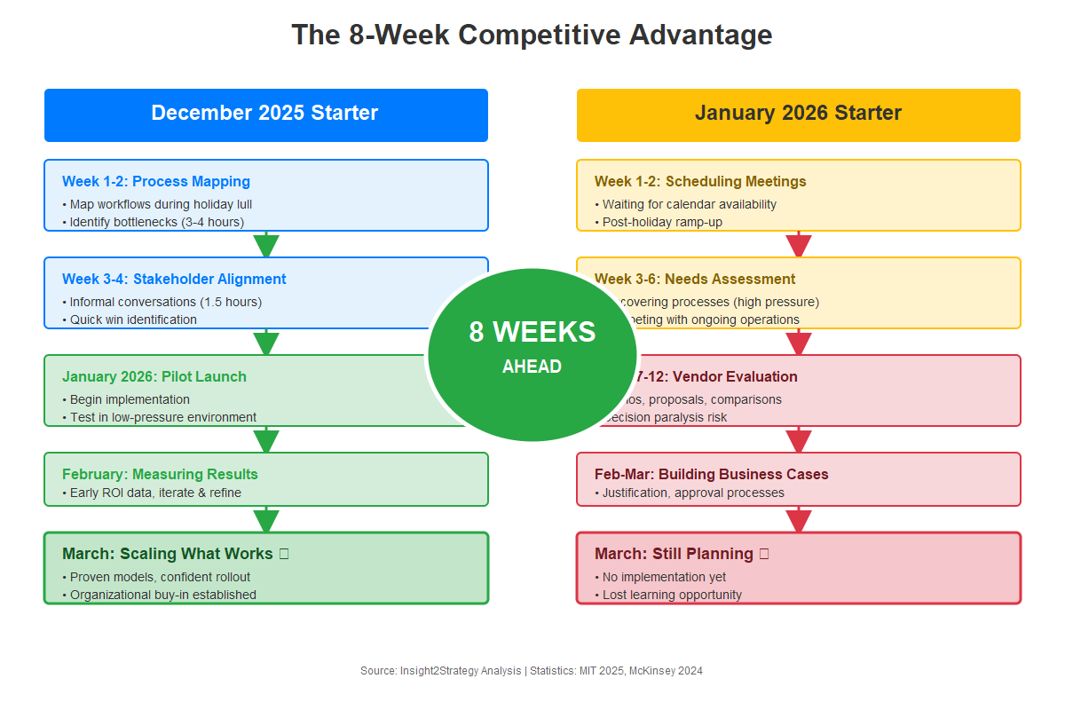 The December Advantage: Organizations starting AI planning in December gain an 8-week learning curve advantage over January starters, positioning them for Q1 implementation while competitors are still in assessment phase.