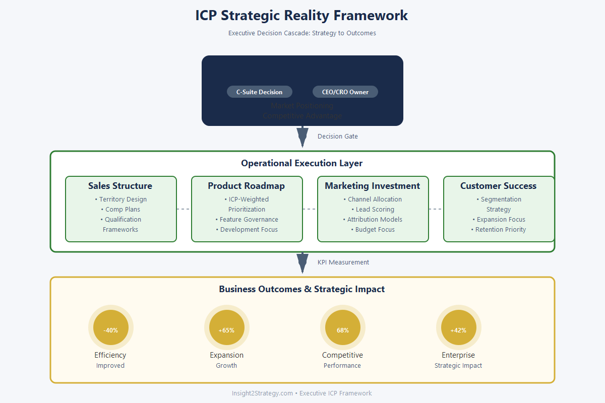 - Quarterly Discipline: Living ICPs require ongoing executive review cycles monitoring both outcomes (CAC, LTV, win rates) and organizational behaviors