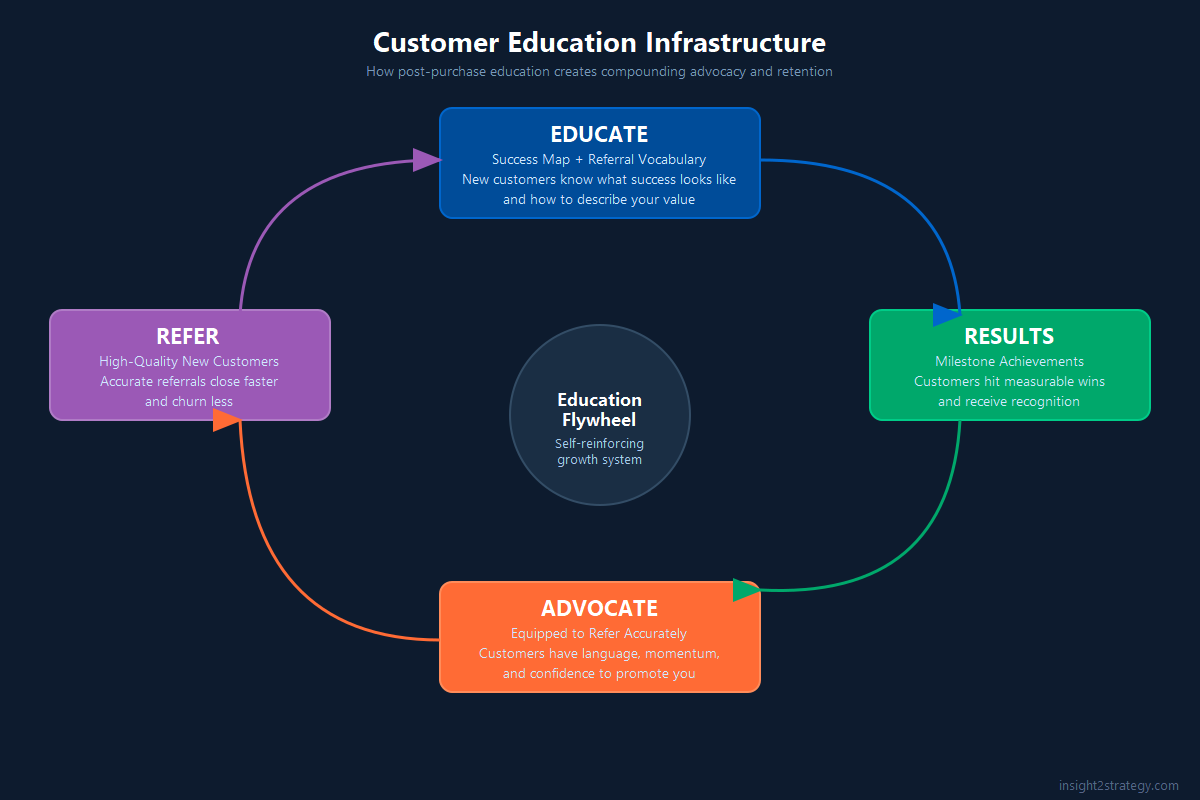 - Post-purchase education operates on three dimensions simultaneously: retention, referral quality, and competitive differentiation