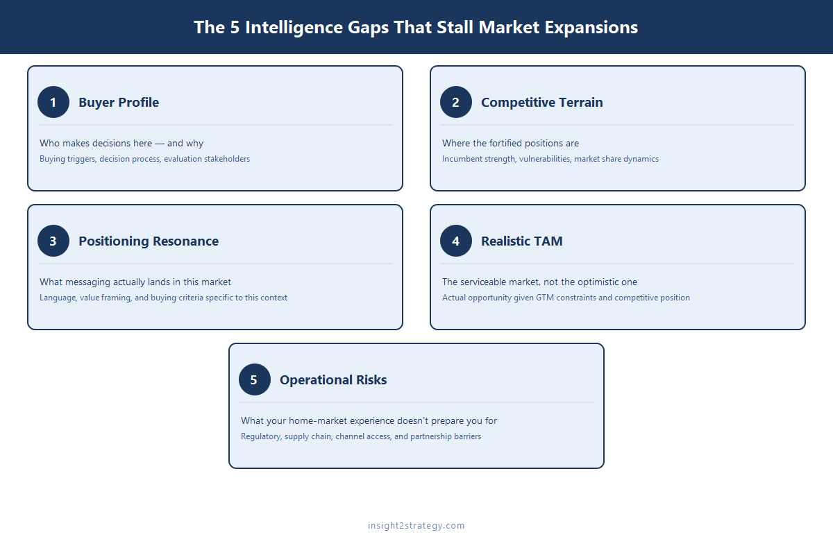 - Five intelligence gaps stall most expansions: buyer profile, competitive terrain, positioning resonance, realistic TAM, and operational risks hidden from home-market experience.